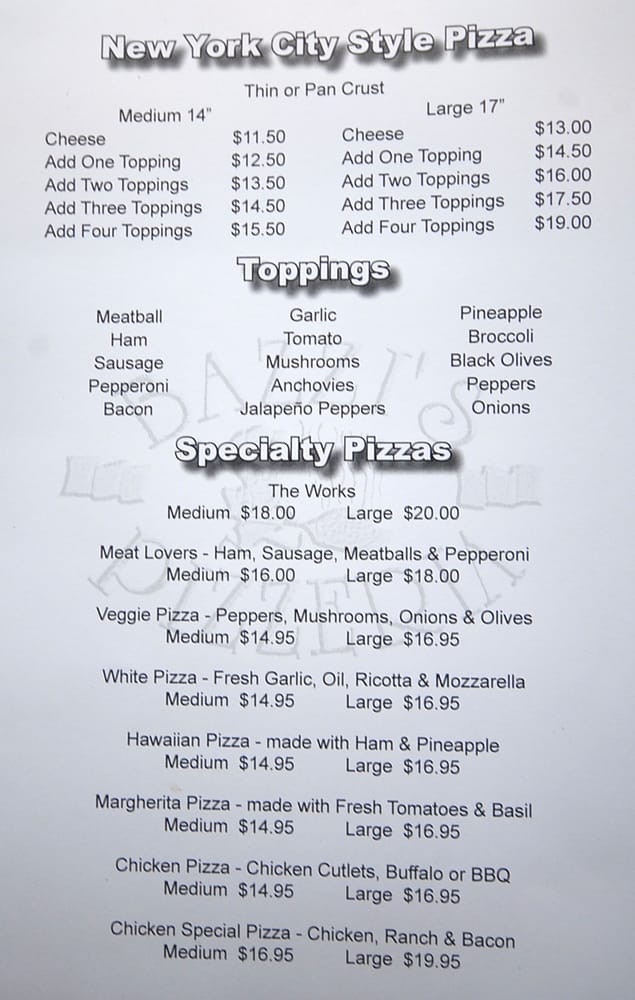 - Subs: Delicious Turkey or Ham Subs that complement any pizza choice.
